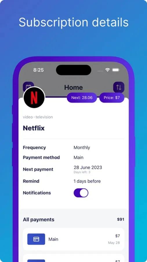 You can use different payment methods - credit card, cash or PayPal that are linked to pay for your subscriptions. ReScribe will help you to keep track of sufficient funds to avoid losing your subscription.
