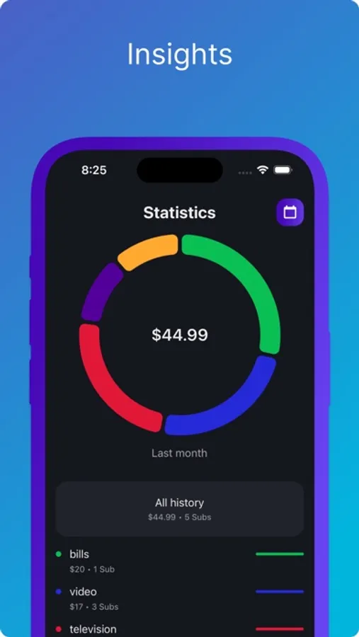 Dive into your subscription expenses statistics filtered by category and time periods.