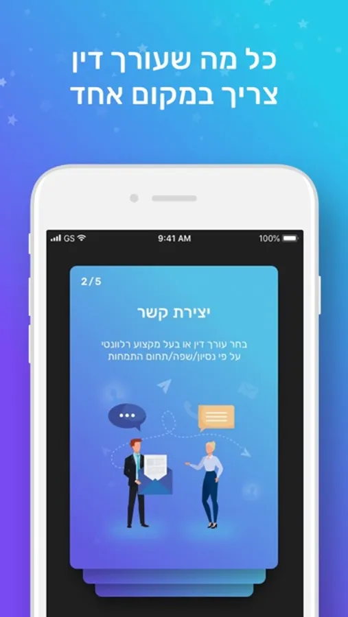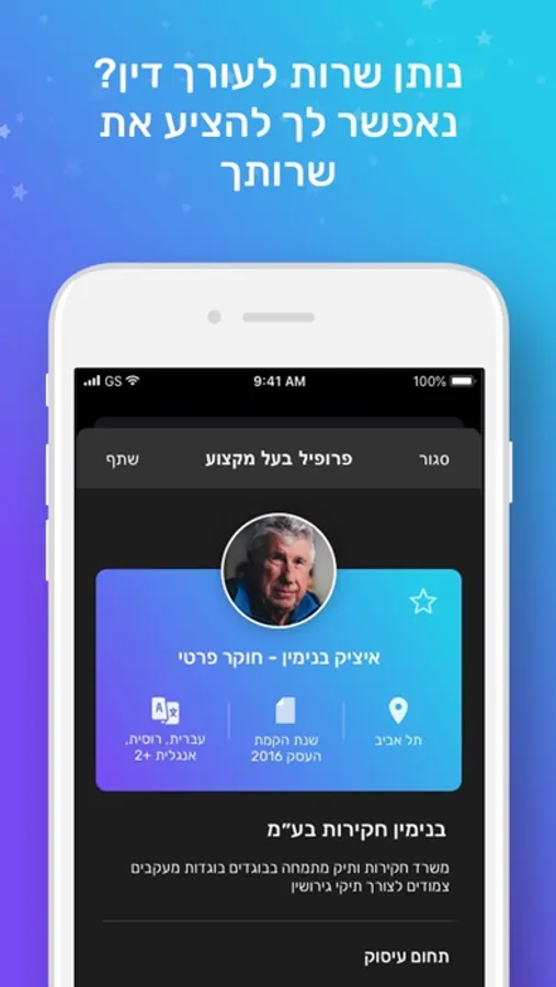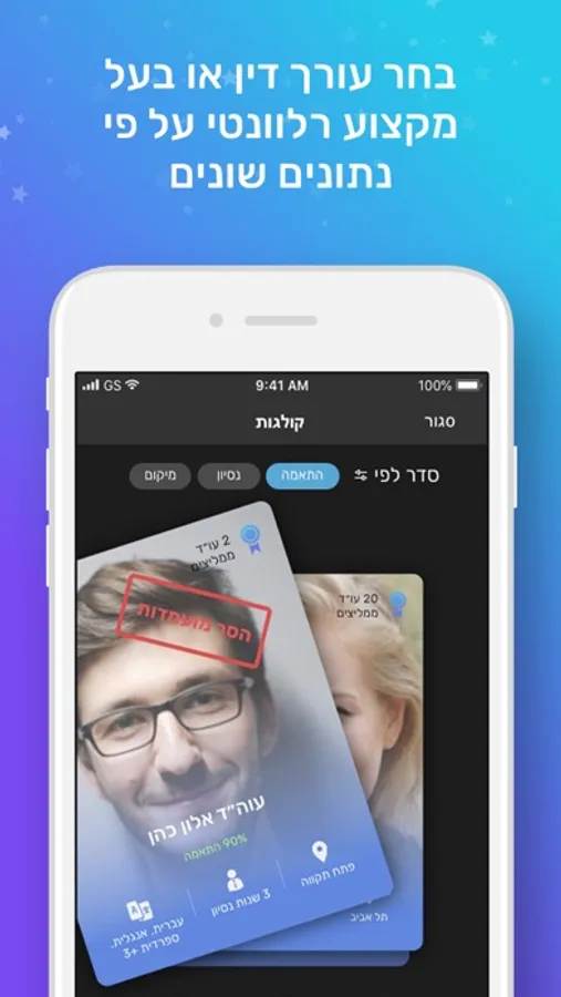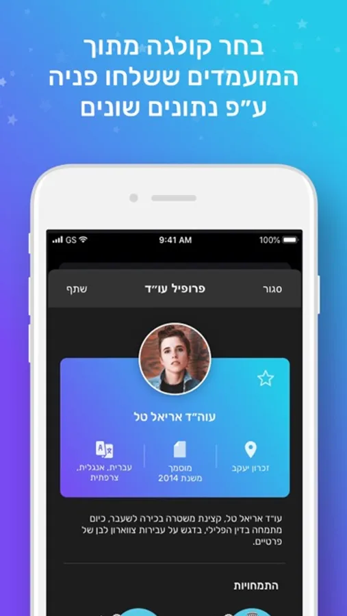 בהרשמה לאפליקציה ניתן ליצור פרופיל אישי, המכיל את כל המידע הרלבנטי והנסיון התעסוקתי בתחום, להגדלת החשיפה המקצועית וליצור קשר ישיר ובלתי אמצעי עם עורכי דין ובעלי מקצוע נותני שירות.