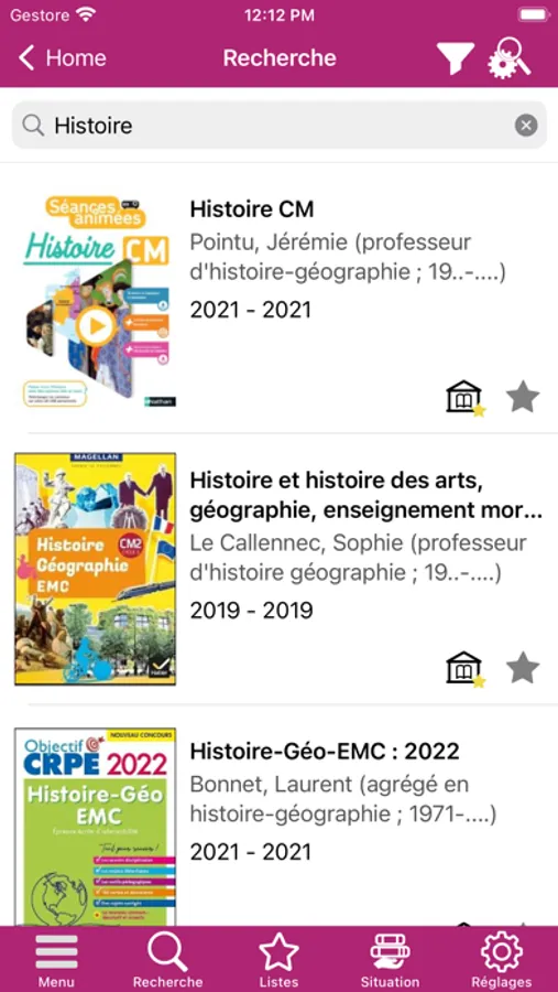 - des filtres de recherches et des facettes (sujet, bibliothèque, auteur, type de document, langue, etc)
