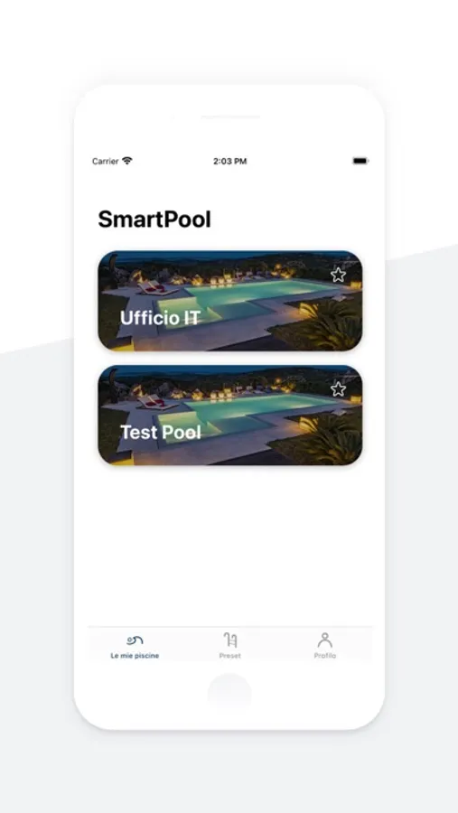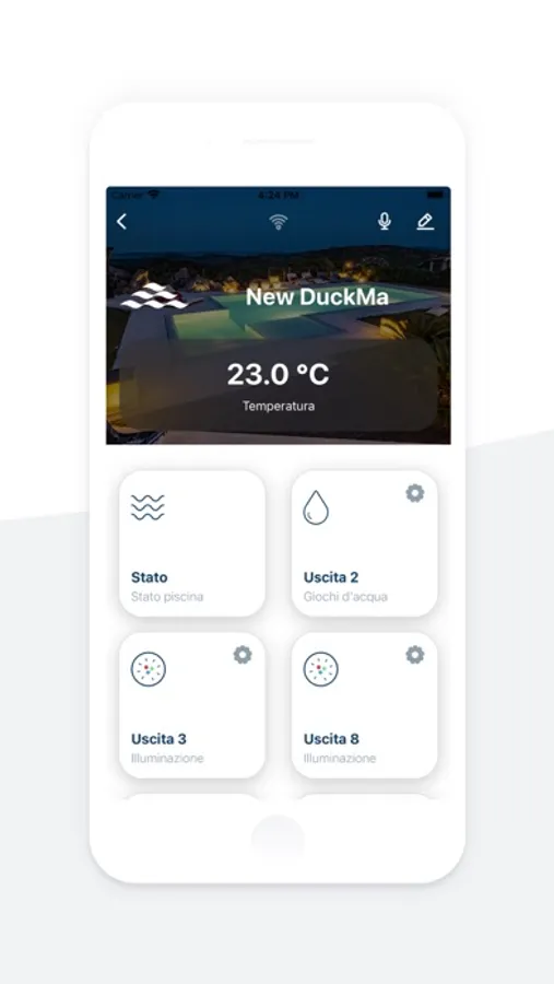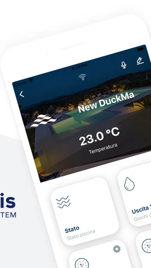 Vengono rilevati in tempo reale i valori dell’acqua e la temperatura. Vengono regolati tramite centraline i principali fattori (pH, disinfezione) per mantenere l’acqua cristallina. Si possono gestire accensione e spegnimento delle apparecchiature e definire un calendario degli eventi con impostazioni automatiche. Un’interfaccia immediata consente di gestire e programmare le luci RGB, personalizzando le impostazioni. Unica nel suo genere, le luci possono andare al ritmo della musica della vostra playlist.