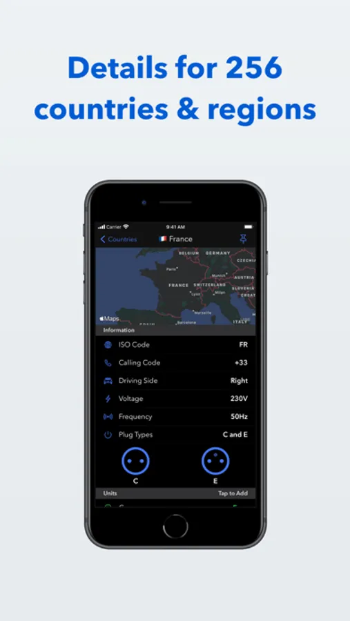 • Countries: view and add common units of measure from 256 countries and regions. Quickly view electrical information, calling codes, driving side, languages, and time zones to help plan your trip.