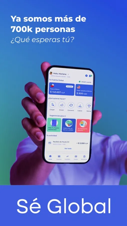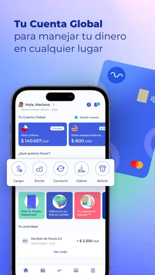 Con Global66 maneja tu dinero de forma segura. Abre Tu Cuenta Global gratis. Paga con Tu Tarjeta Global66 Mastercard online o físicamente en tu país o en todo el mundo. Envía y recibe dinero sin importar dónde estés. Convierte tus pesos a dólares, euros y otras monedas con un click. Cobra internacionalmente con un link y haz que tus negocios no tengan fronteras.