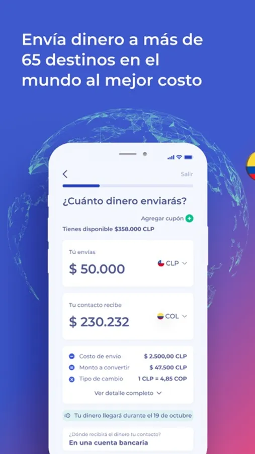 - Transfiere en pocos clics en tu país o a más de 65 países directo a cuentas bancarias o retiro en efectivo con el mejor precio garantizado