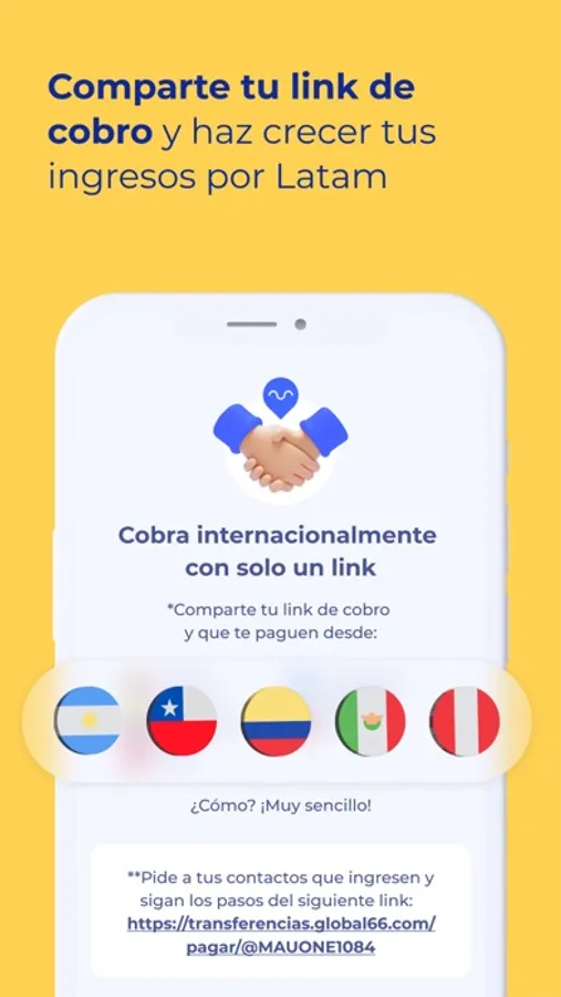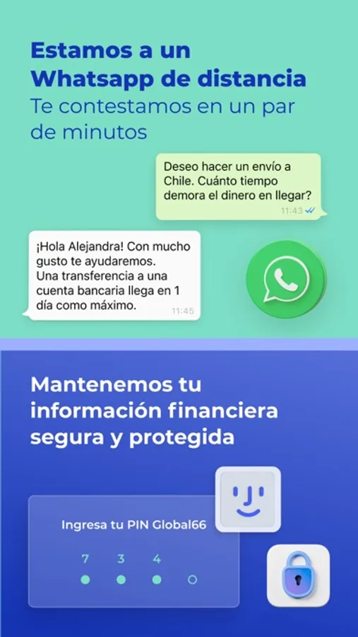 Tan fácil como mandar un Whatsapp ¿Estás en Chile? Transfiere entre usuarios Global66 y envía dinero a Argentina, México, Colombia, Ecuador y Perú en 2 clics y instantáneamente ¿Conoces a Usain Bolt? Nosotros somos más rápidos :)