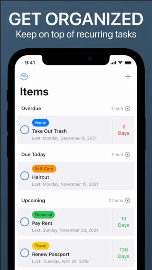 Recurrence helps you manage and track everything relating to the repeating tasks in your life so you never miss a thing again.