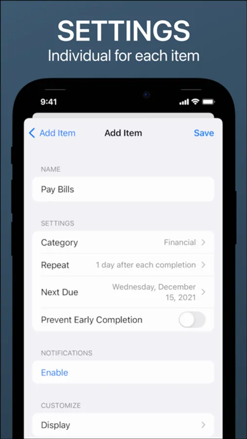Create tasks that repeat when you need them to with customizable options including a lock that prevents a task from being checked off before it's ready.