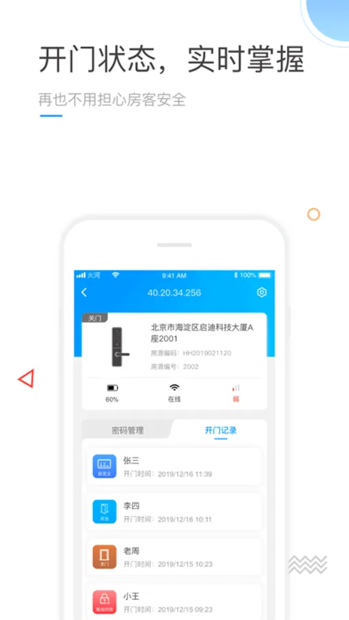 火河智能APP,系北京火河科技有限公司自主开发,主要实现对火河科技商用智能门锁的管理和操作功能,目前可支持火河科技NB门锁。其主要功能包括添加和管理门锁、添加和管理开锁用户、添加管理开锁密码和门卡、设置用户权限和密码有效期等操作功能,以及查看门锁状态、开锁记录和门锁消息提醒等信息。