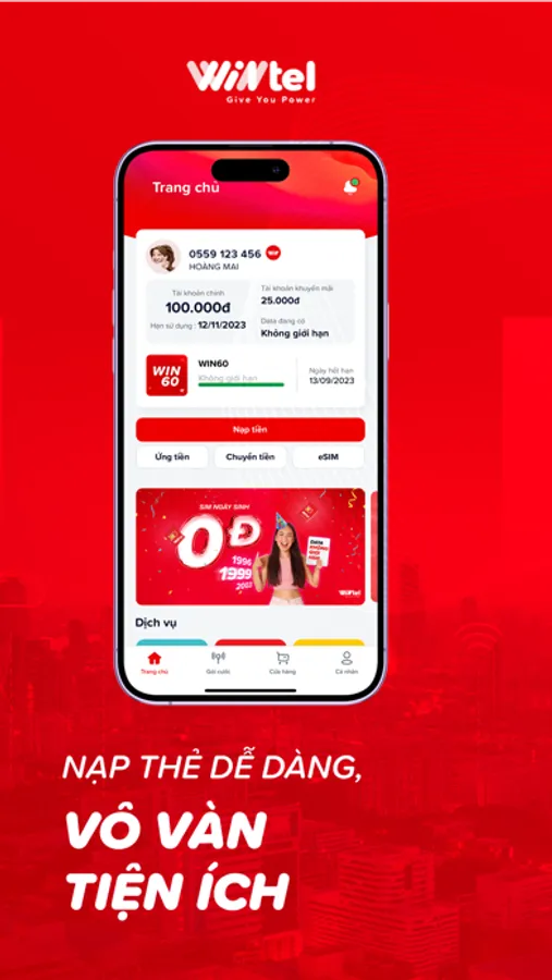 Ứng dụng quản lý tài khoản viễn thông cá nhân của Mạng di động Wintel. Quý khách dễ dàng thao tác với các tính năng tiện lợi: Chọn số - mua SIM; kích hoạt SIM, đăng ký thông tin; Đăng ký/Hủy gói cước, dịch vụ; Nạp tiền; Quản lý lịch sử tiêu dùng…