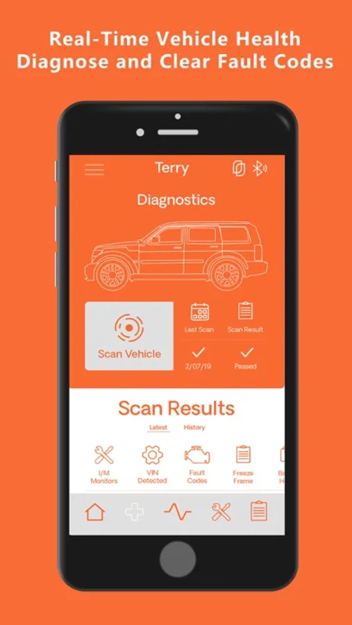 • Full engine diagnostics, fault codes cause and fix reports, freeze frame data I/M readiness and clear fault codes.