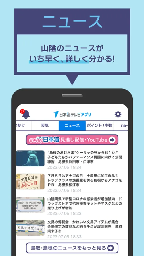 鳥取・島根のテレビ局「日本海テレビ」公式アプリ。山陰のニュースや生活情報をいち早くお届けします!