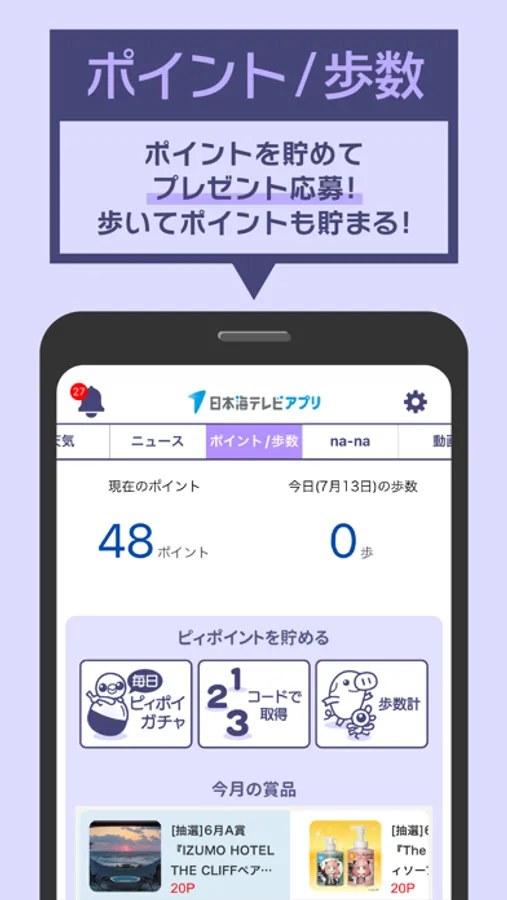 歩数計とも連携し、歩いた歩数によって毎日ポイントが貯まります。貯めたポイントで毎月豪華プレゼント企画に応募できます。