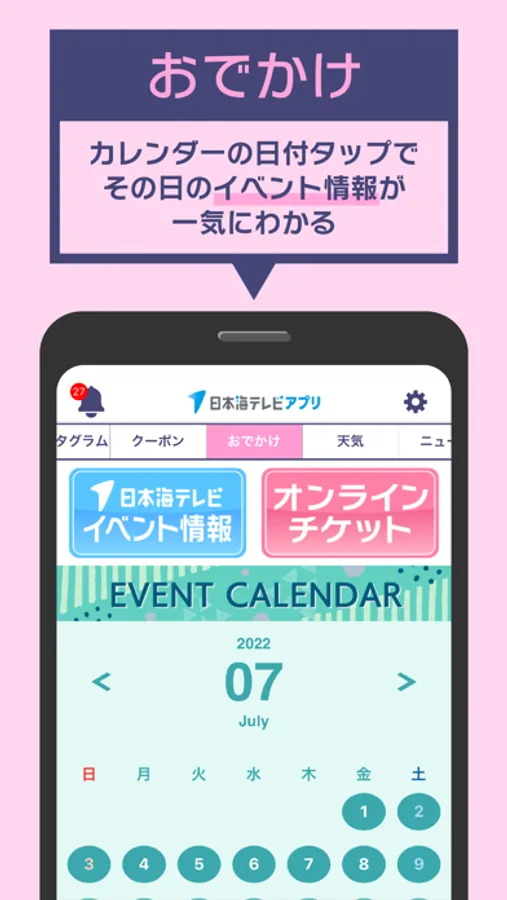 カレンダー形式のおでかけ情報まとめページ!日付をタップすると、その日のイベント情報一覧を見ることができます。