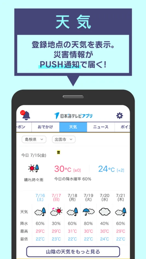 緊急速報や特別警報、警報の発表時にはプッシュ通知でお知らせします。