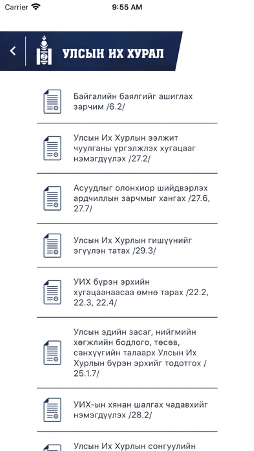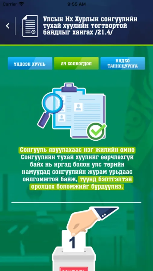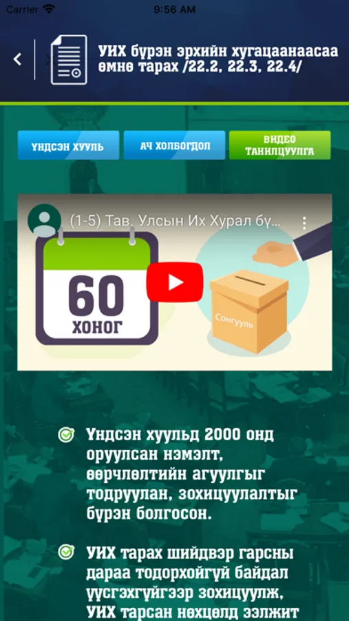 Үндсэн хуульд ямар өөрчлөлт орсон, тэр нь ямар агуулга, ач холбогдолтойг танин мэдэх боломжтой. Аль болох ойлгомжтой, энгийн хялбар, тодорхой байх зарчмыг баримталж, энэхүү application-ийг бүтээсэн болно.