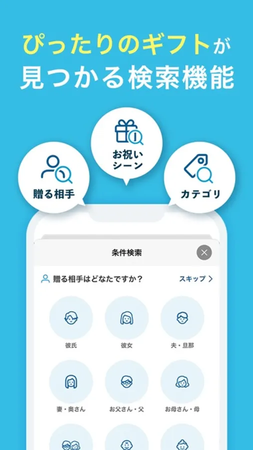お相手、イベント、カテゴリなどシチュエーションに合ったギフトやプレゼントを探せます。