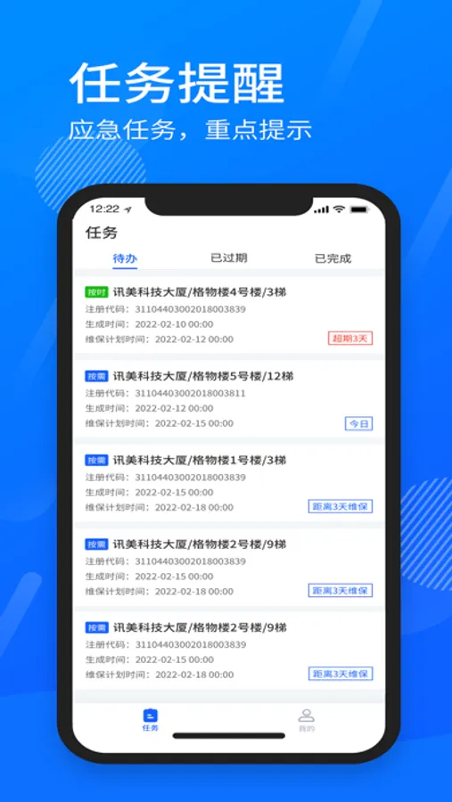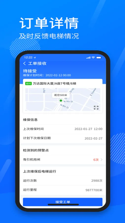 梯叮咚维保是一款专为电梯维保公司打造的线上维保工具,账号由维保公司后台添加。维保人员可以通过梯叮咚维保线上接单,并将维保人员所在公司的日常按时维保任务指派给对应人员,提高了电梯维保的即时性,并对维保完的电梯进行检测,防止忽略异常情况,为乘客的安全保驾护航。通过线上填写维保检测信息,省去了纸质化过程,有利于环境保护。维保人员还可以通过查看电梯维保记录,了解电梯过去存在的问题,可以提高维保人员的工作效率。