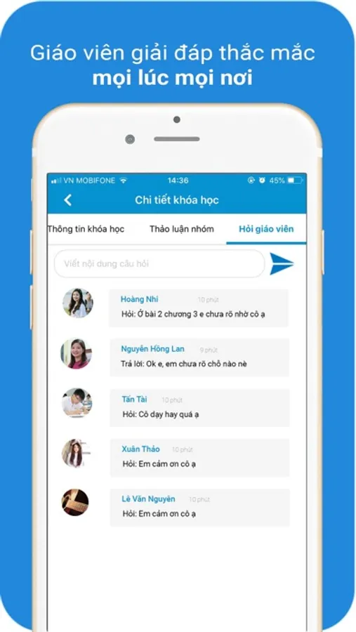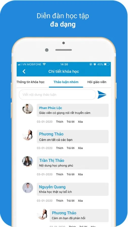 - Diễn đàn học tập: Học viên có thể thảo luận với các học viên khác cũng như gửi câu hỏi đến cho giáo viên giảng dạy ngay trên app.