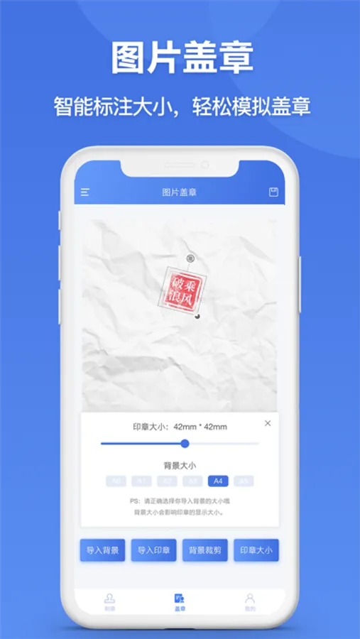 · 图片一键盖章:选择背景图片,智能标注印章真实大小,轻松将印章随意盖到图片上
