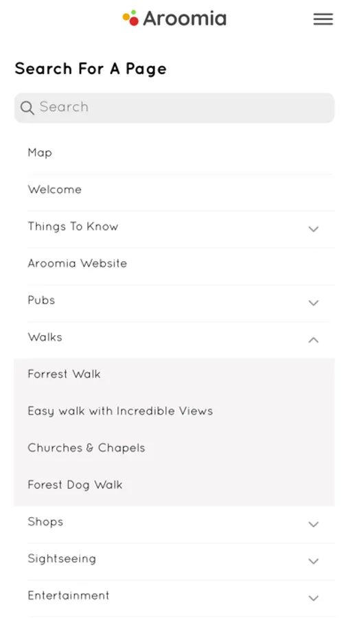 Search - Search allows you to search through the titles of places, pages and events within the app to find something quickly.