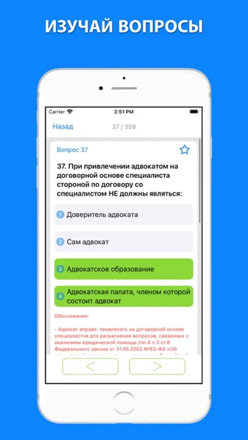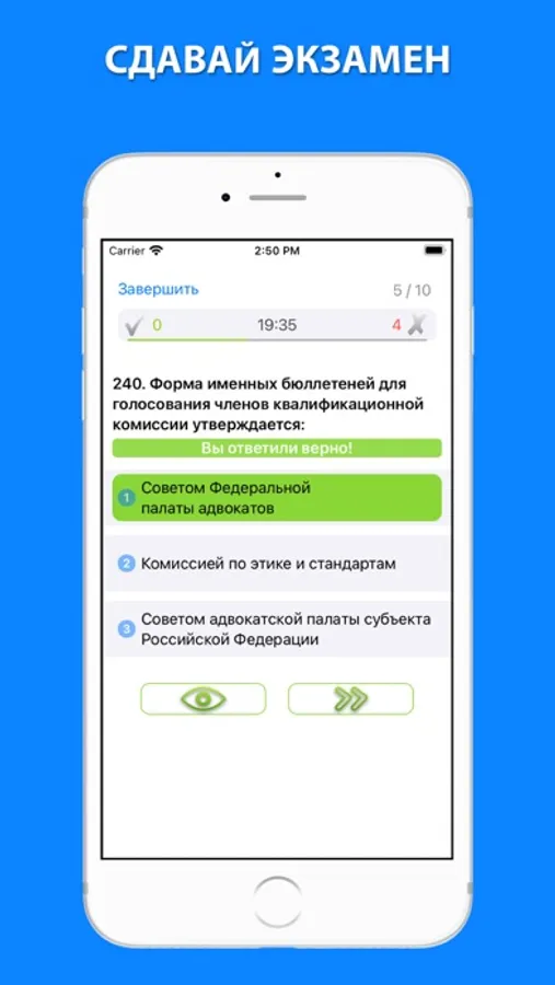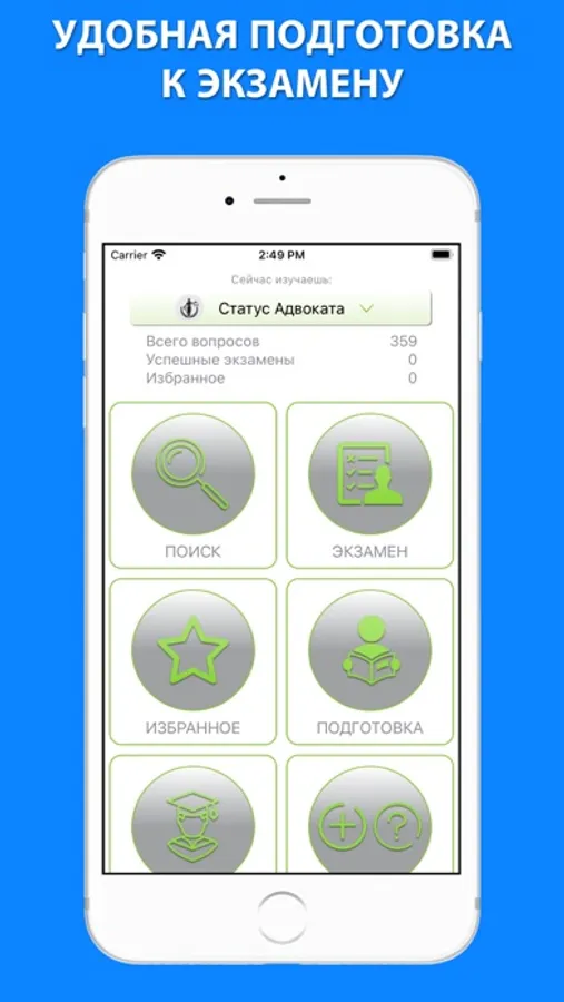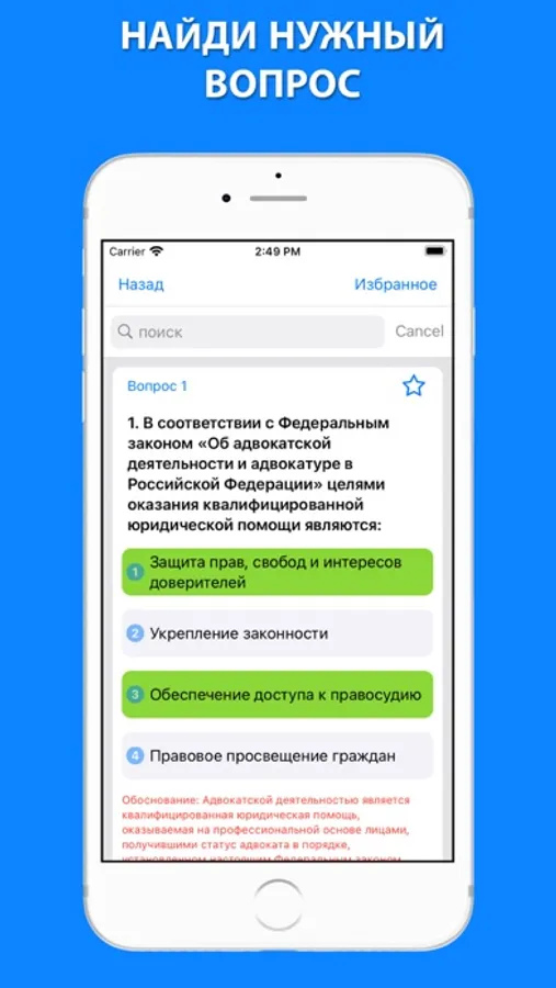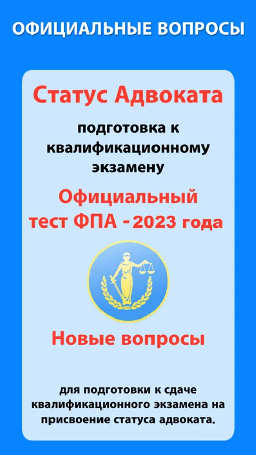Тест-тренажер создан для оперативной подготовки к тестам которые используют при сдаче экзамена на статуса адвоката. Прохождение тестов на знание ФЗ «Об адвокатской деятельности и адвокатуре в РФ» и Кодекса проф этики адвоката является первой ступенью при сдачи экзамена.