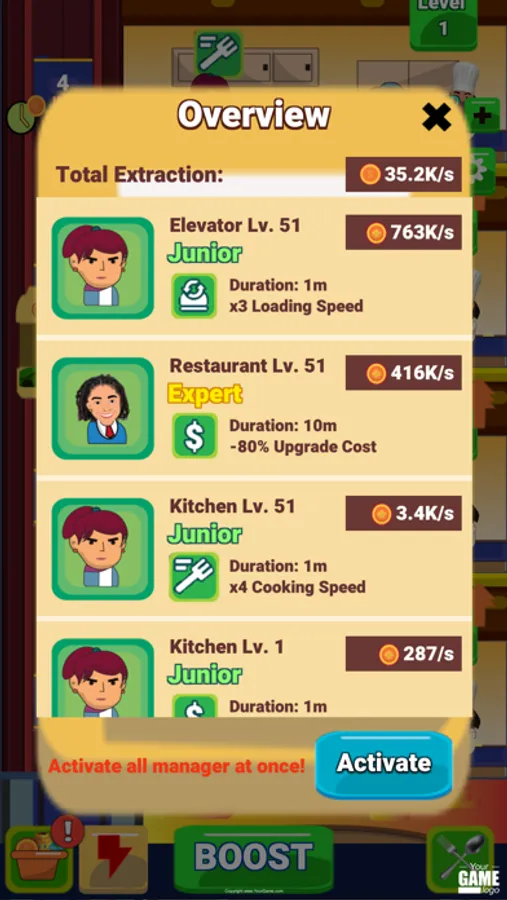 The game consists of boosters for the Managers and the Rah's Chef. You can activate all at one from the menu of Fork and Knives or tap on the specific Managers booster one by one. The game consists of three Managers of which 2 are normal but 1 is a special one that is the Rah Manager which will speed up the whole process of the items which is under the Management of the Rah Manager.