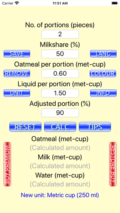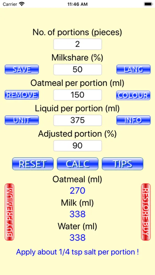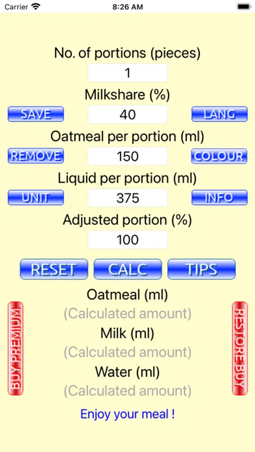 Based on these values, it is calculated how much oatmeal, milk and water to apply.