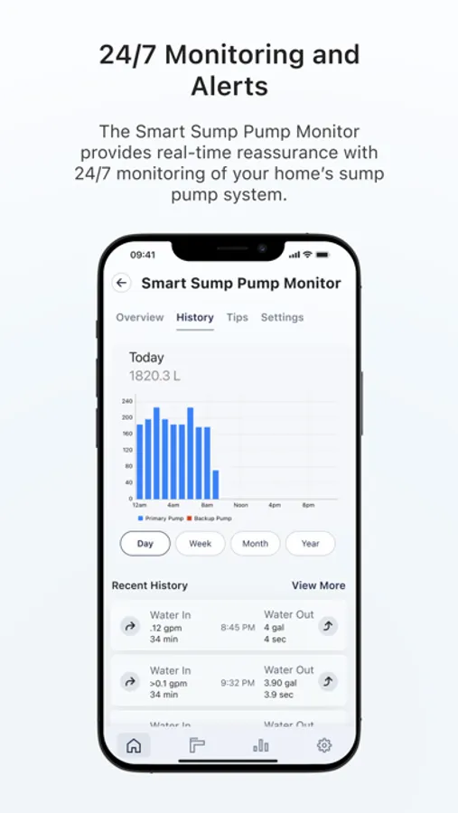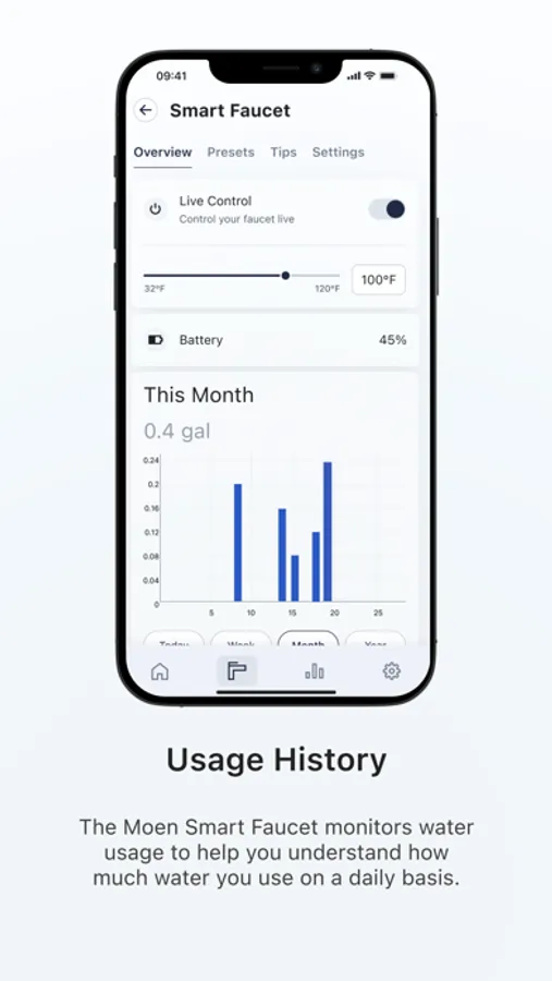 · Track Water Usage: See your home’s total water usage by fixture type to know when and where water is being used.