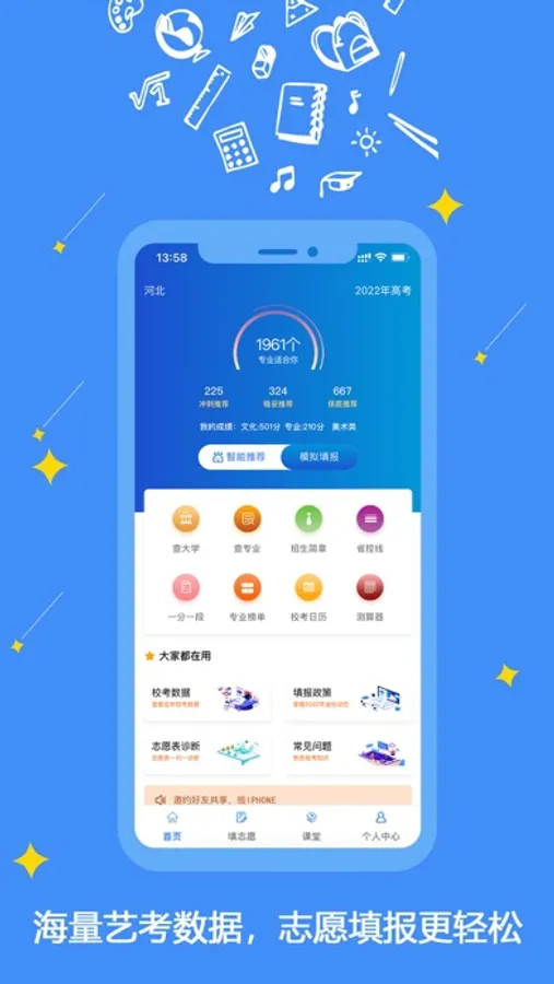 【艺愿星】是伯函网络科技面向高中艺术学生和家长推出的一款辅助高考志愿填报的软件工具平台。该平台以学生的成绩或位次为参考,在往年高考录取分数基础上,通过基于大数据分析和概率测算的独特算法,根据考生预估的专业成绩(分数/位次)和文化成绩(分数/位次),模拟推荐高校及专业,为志愿方案的完善和优化提供助力,为艺术考生填报志愿提供参考。