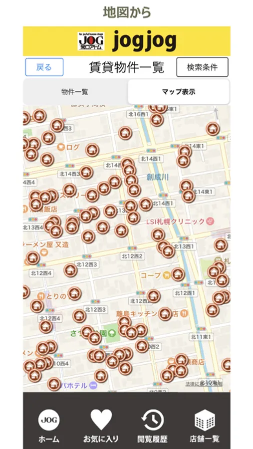 賃貸住宅(お部屋探し)、オフィス・テナント、売買物件の3つの種別にそれぞれ、「地図から」「住所から」「沿線から」「学校名から」の検索を設け、計12個の目的ボタンをホーム画面に配置。