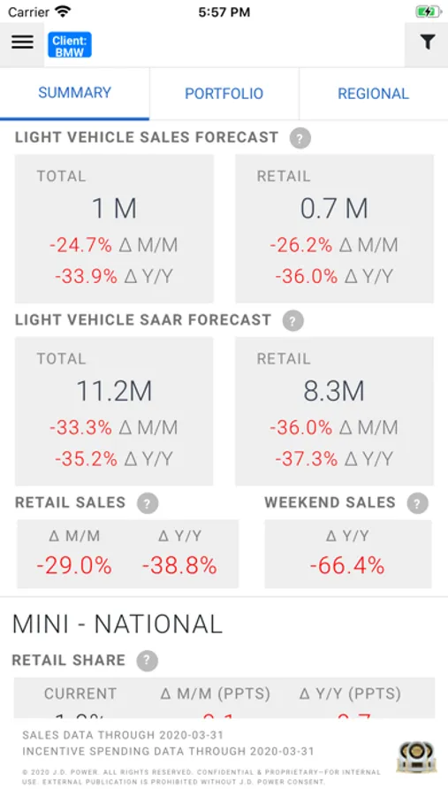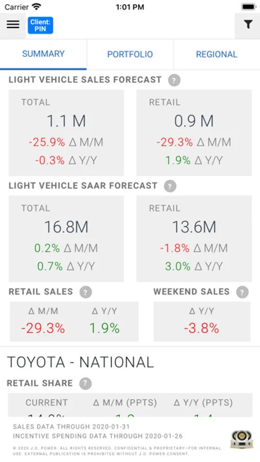 Introducing PIN Mobile, a mobile application that will connect key decision makers across the Auto industry (and across the company) with PIN sales and incentive spending information. This tool will support easy and rapid communication of near real-time market intelligence across our clients as well as across the expanding JD Power organization. PIN Mobile represents a first, but very important step toward a modern data storage and delivery platform. This site, supported by the Auto Analytics platform, will be expanded via the modernization effort to encapsulate the full suite of PIN Analytics outputs and enable clients to access best-in-the-business market intelligence via powerful data visualization tools.