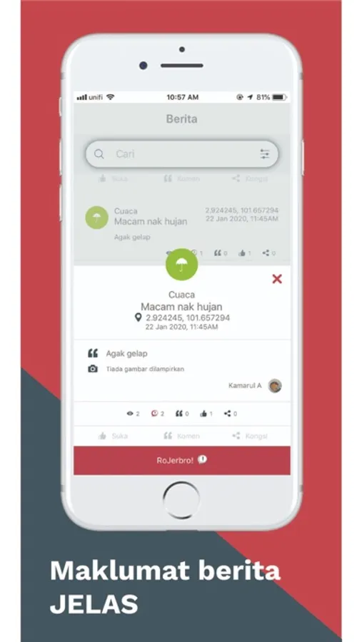 RoJerbro membantu menyelesaikan masalah meletak kenderaan anda. Samada anda menghalang kenderaan orang lain atau kenderaan anda dihalang, gunakan RoJerbro untuk memberitahu dan menghantar mesej memaklumkan kepada pihak yang terbabit secara terus. Mudah bukan? Dapat makluman berita dan peringatan terkini daripada komuniti di sekeliling anda.