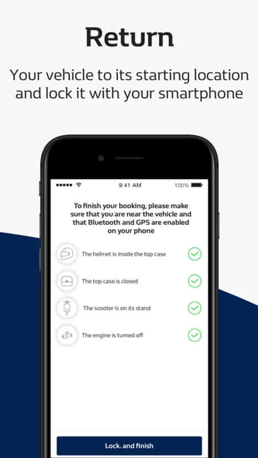 4. At the end of the booking, return the scooter to a designated parking space at the sharing station, replace the helmet and lock the scooter with your phone.
