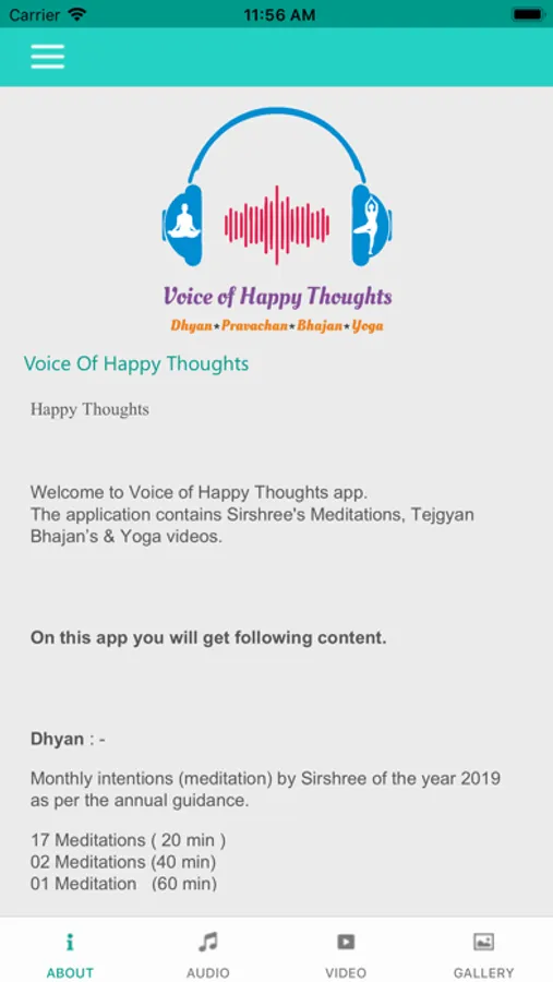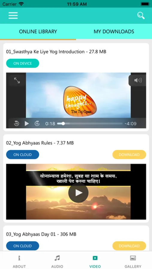 The application contains Yoga videos & Tejgyan bhajans. You will be able to access the following in this app: