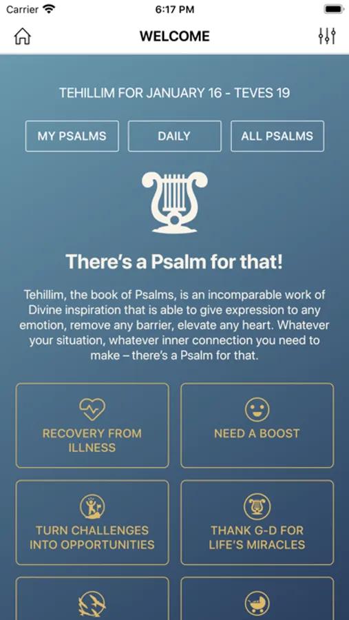 This App is part of The Psalm for That Drive which has been launched in order to encourage people to increase in saying Psalms, whilst simultaneously fulfilling the Rebbe’s wish of having a Psalm book in all Jewish homes and children’s bedrooms, so we can all experience the transformational power of Tehillim for ourselves.