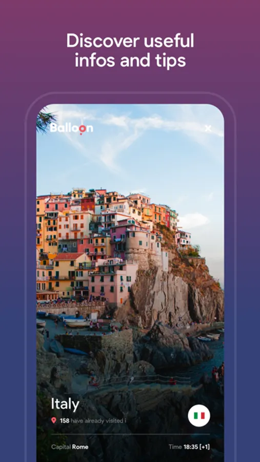 Balloon thanks to artificial intelligence will suggest new nations to discover that you have not yet visited based on the percentage of compatibility and your feedback provided. Get inspired by Balloon and discover new countries to visit.
