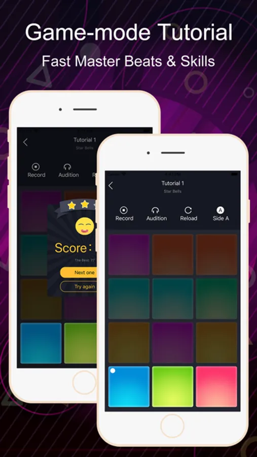 Way 1: Step Mode, also called tutorial mode, in each music pack, we've designed interesting tutorials which tells you how to tap the pads to create the track, only when you pass the former tutorial, can you enter the next, which makes you feel like playing a music game. Every time you practise the tutorial, it will give you a score telling how well you perform.