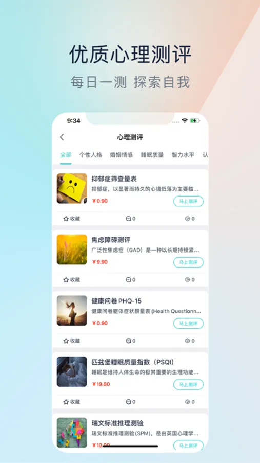 抑郁焦虑测评、性格测评、趣味测评等各类专业心理测试,带您探索更多未知的自己。