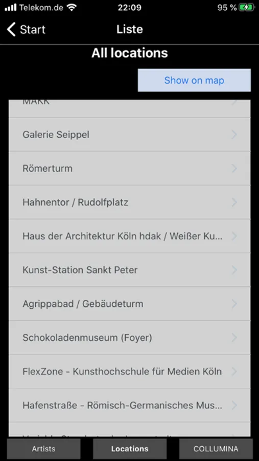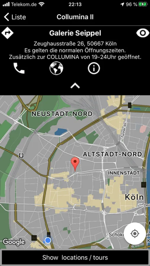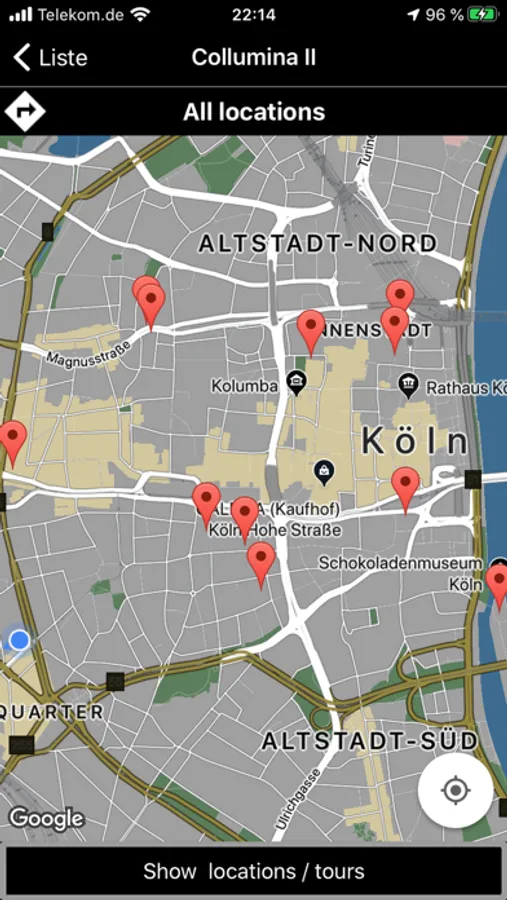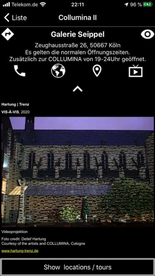 This app was developed for visitors of the Cologne light art project "COLLUMINA" and should serve as a companion there. The app offers information about artists and locations in a compact form. In addition, access to the website of the location operators is made possible in order to get a complete picture. Navigation options can be used to display the route to one or more locations in the form of a route.