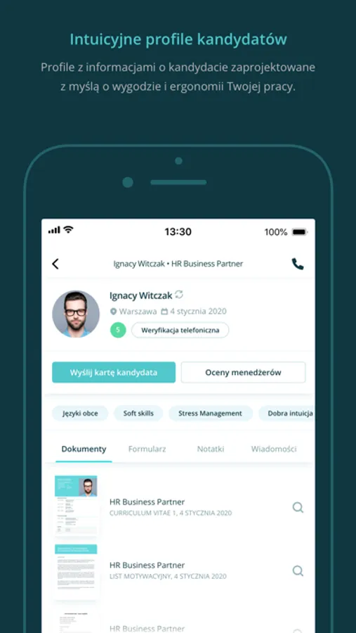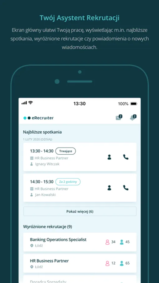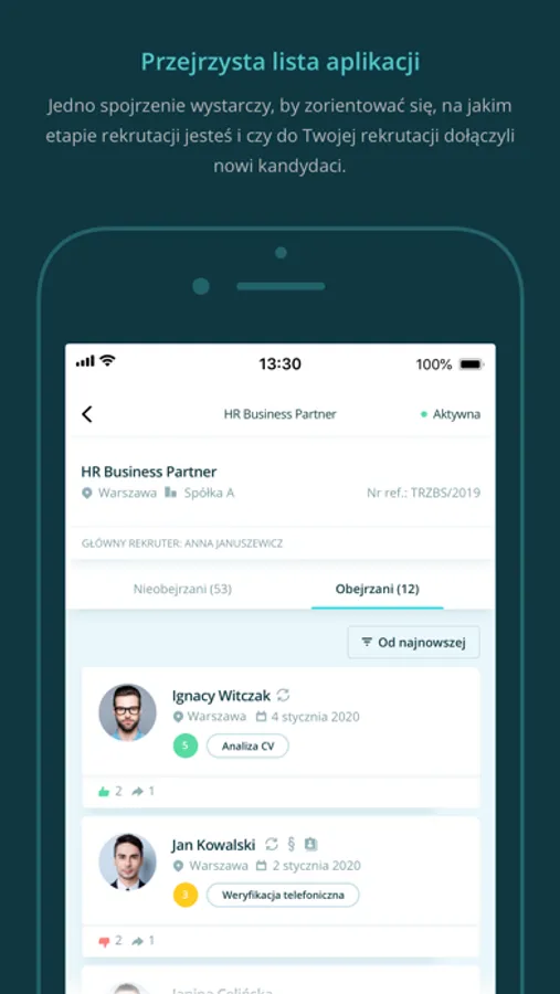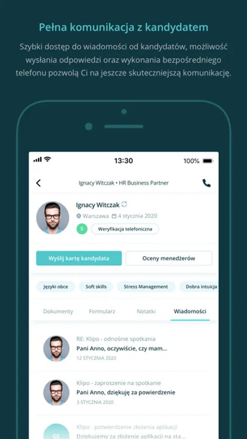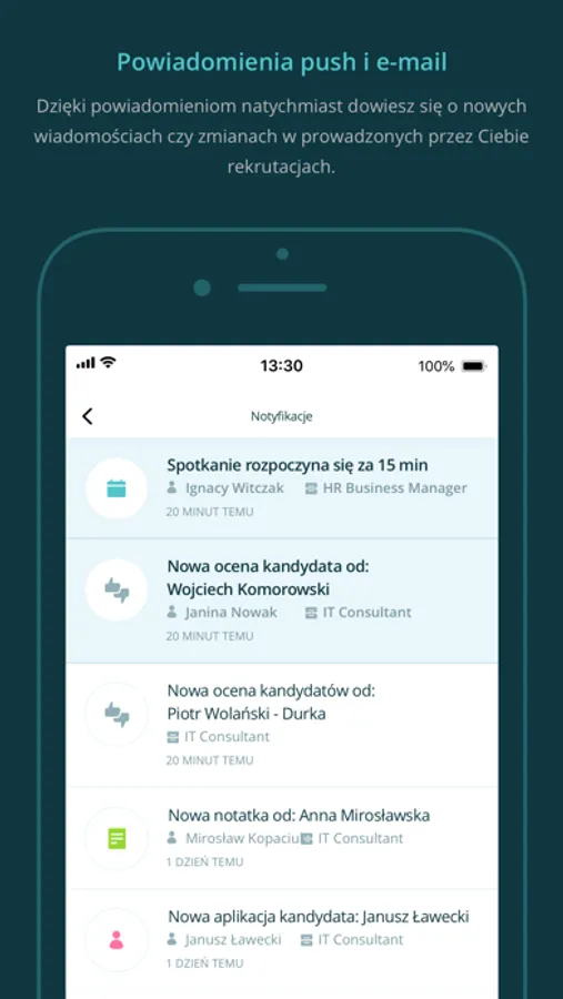 • Natychmiastowe powiadomienia o nowej wiadomości od kandydata, odwołanym przez niego spotkaniu oraz nowej ocenie menedżera.