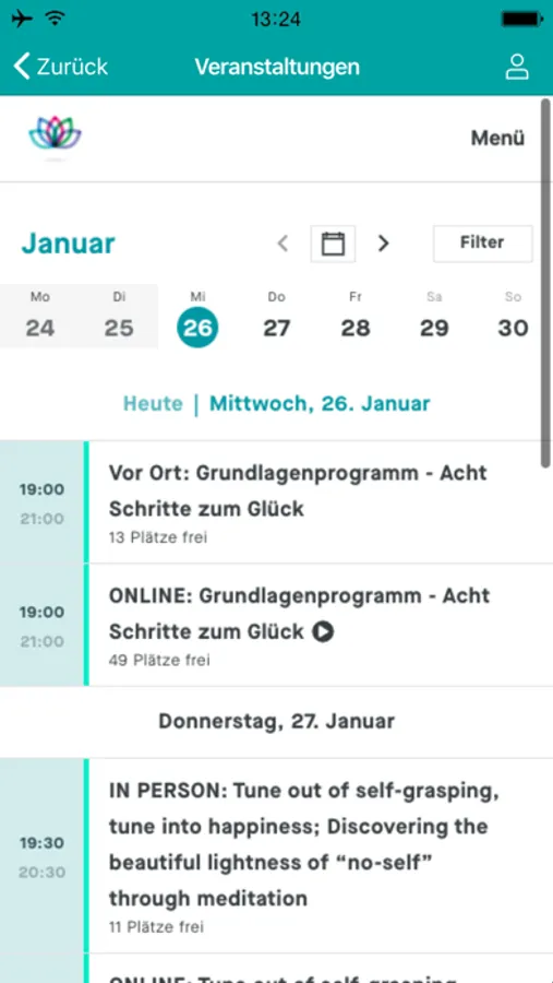 Mit dieser App hast du jederzeit den vollen Überblick über die Veranstaltungen des Kadampa Meditationszentrums (KMC) Berlin und kannst diese schnell und einfach buchen. Wir bieten an Wochentagen geleitete Meditationen zu verschiedenen Tageszeiten an, Meditationskurse am Sonntagnachmittag sowie Unterricht zu Themen des Kadampa Buddhismus, die einen praktischen Nutzen für den Alltag haben.