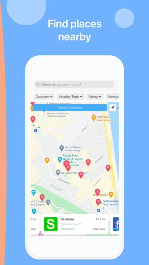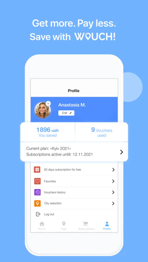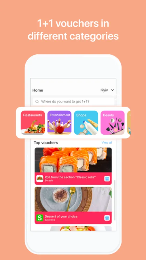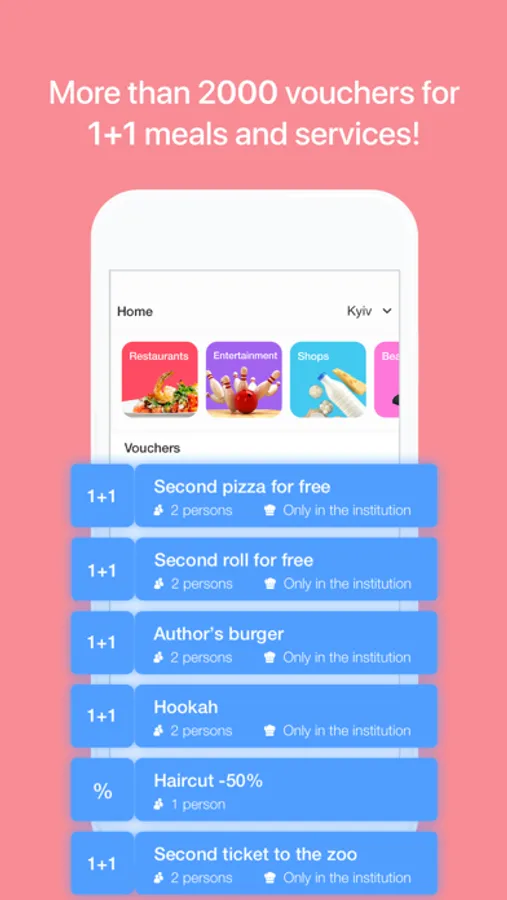 WOUCH! service - an application with a catalog of special offers from restaurants, cafes, beauty salons and other companies, that offer +1 free service for residents of Kyiv.