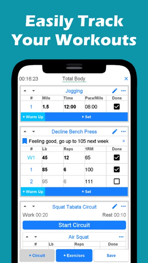 - Real time circuits with automatic timer (Tabata, EMOM, AMRAP, etc.)