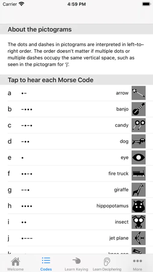 •Morse Code reference list, including pictograms that makes learning the dits (dots) and dahs (dashes) of most characters much easier, and sample playback of each Morse Code.