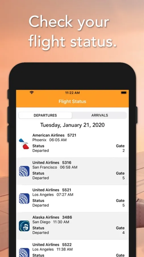 - Detailed flight information (flight number, destination, gate, baggage claim, time, and flight status).