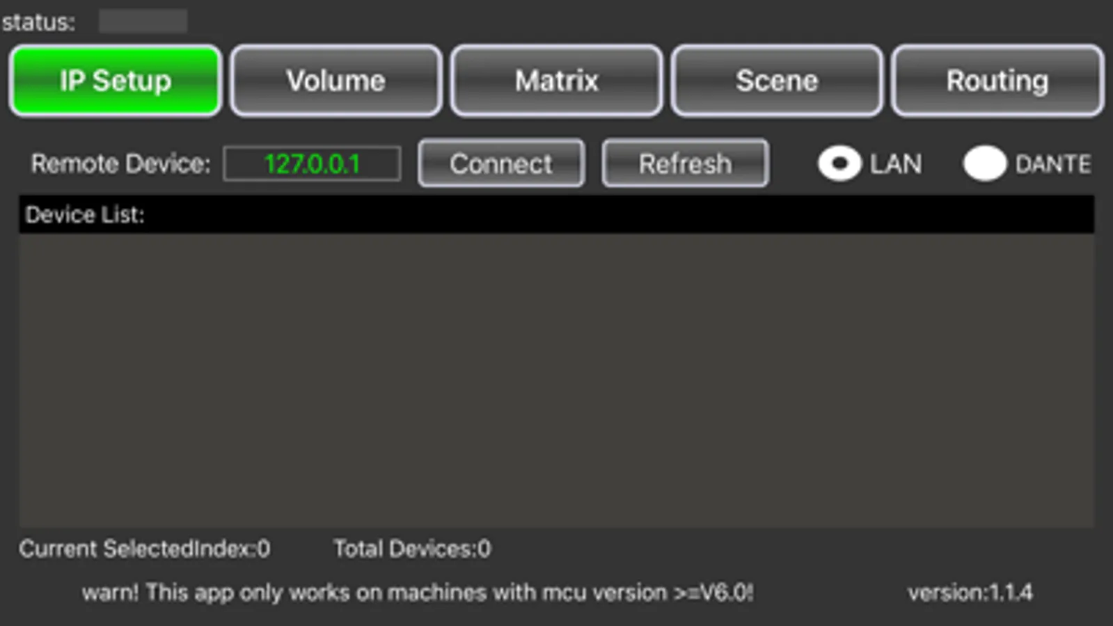 Open the app, it will display the IP Setup interface, and connect to the LAN via WIFI. It will automatically search for the devices that have connected to Matrix A8 in the LAN of this interface. If no device is found, click the Refresh button to manually search. Select the device and click the Connect button to connect the device. When the indicator lights green, it indicates that the device is successfully connected.