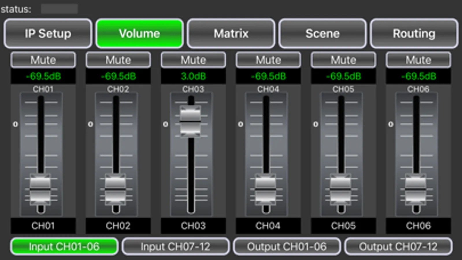 The Volume interface displays the gain value and channel name of each channel. You can select and change the channel name, adjust the gain value, and mute the channel in this interface.