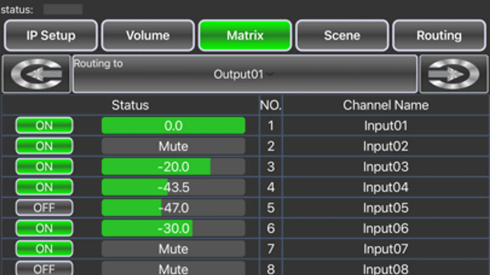 The Routing interface displays and adjusts multiple input channels assigned to the output channel. Specifically, the output channel can be selected through the “routing to” button in this interface. Select the input channel by clicking on the buttons in the list below.