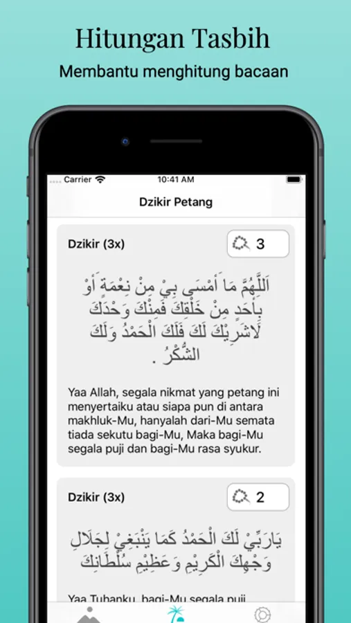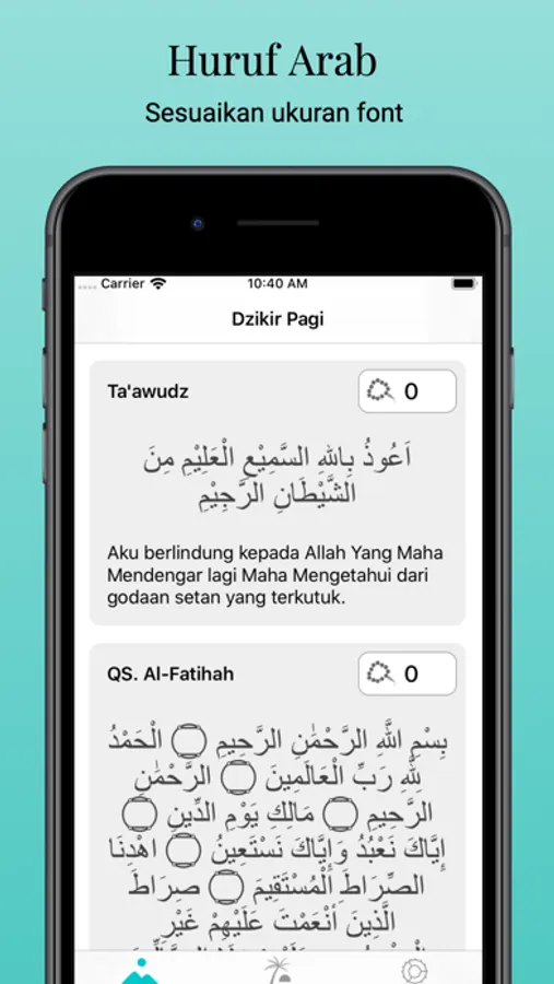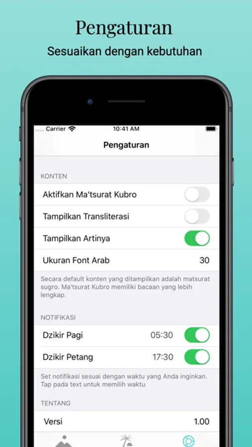 Anda juga akan mendapatkan notifikasi untuk melakukan dzikir pagi atau dzikir petang. Waktu notifikasi juga bisa Anda atur di menu pengaturan. Ada tiga jenis font Arab yang bisa Anda pilih sesuai dengan keiinginan.