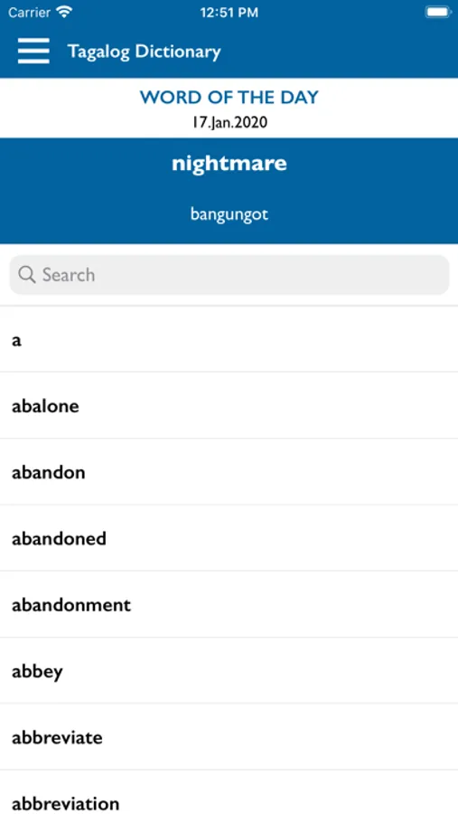 Download the best offline Tagalog translation and dictionary with over 1 lac of Tagalog and English words. The dictionary contains words with meaning, definition, usage example, and antonyms.